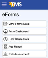 Permissioned users may view Forms Data, Form Dashboards, Root Cause Data, Aging Reports and Risk Assessment within eForms.